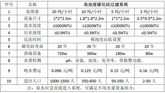 1、設(shè)備整體壽命20年,運(yùn)行無需添加任何藥劑,10分鐘出水,并且出水濁度0.5NTU 以下;
