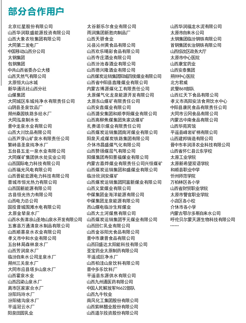 公司主要經營供水,在職員工有30人,與多家長治自來水廠黃頁零售商和代理商建立了長期穩定的合作關系,品種齊全、價格合理,企業實力雄厚,重信用、守合同、保證產品質量,以多品種經營特色和薄利多銷的原則,贏得了廣大客戶的信任,公司始終奉行“誠信求實、致力服務、唯求滿意”的企業宗旨,全力跟隨客戶需求,不斷進行產品創新和服務改進。